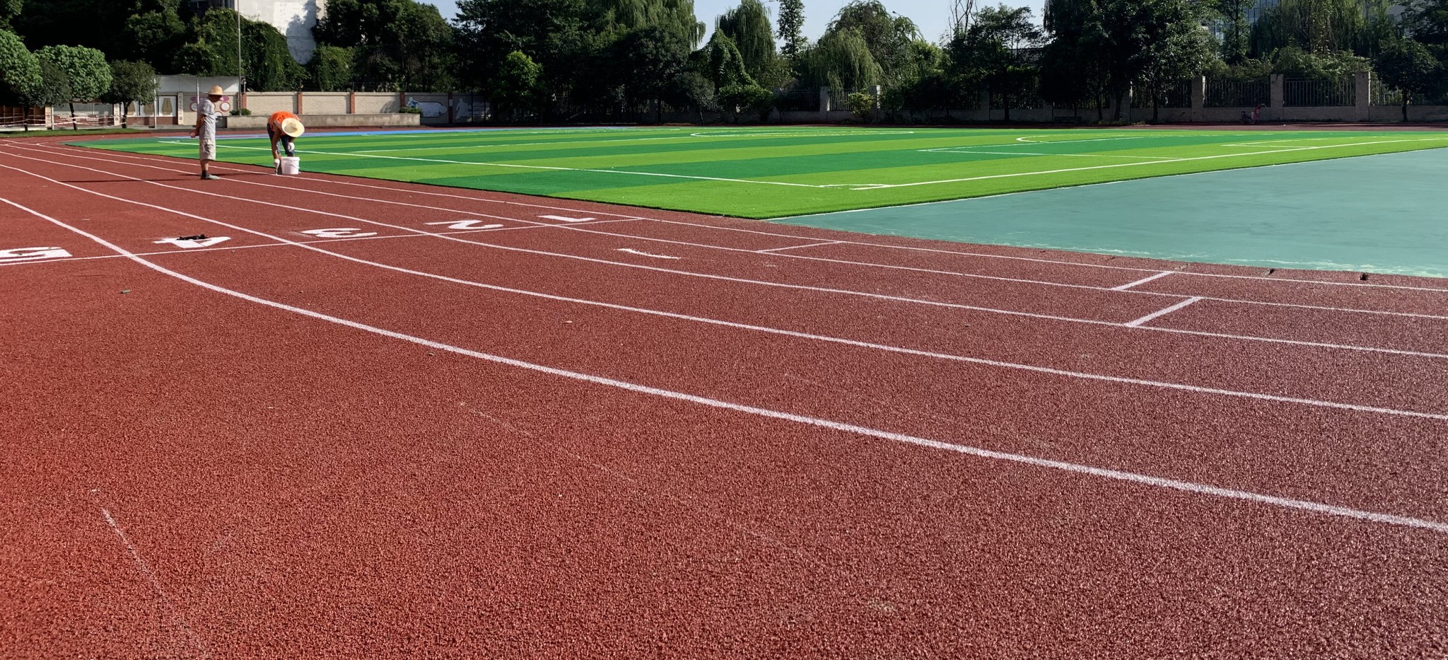 透氣型塑膠跑道安全、經(jīng)濟、耐用,底層采用單組份聚氨酯膠水與EPDM橡膠顆粒相結合,經(jīng)由攤鋪設備制成緩沖墊層。面層為耐磨聚氨酯面漆混合一定比例的EPDM顆粒噴涂面層,具有疏水透氣的功能,適用于各地大中小學田徑場地的鋪設。