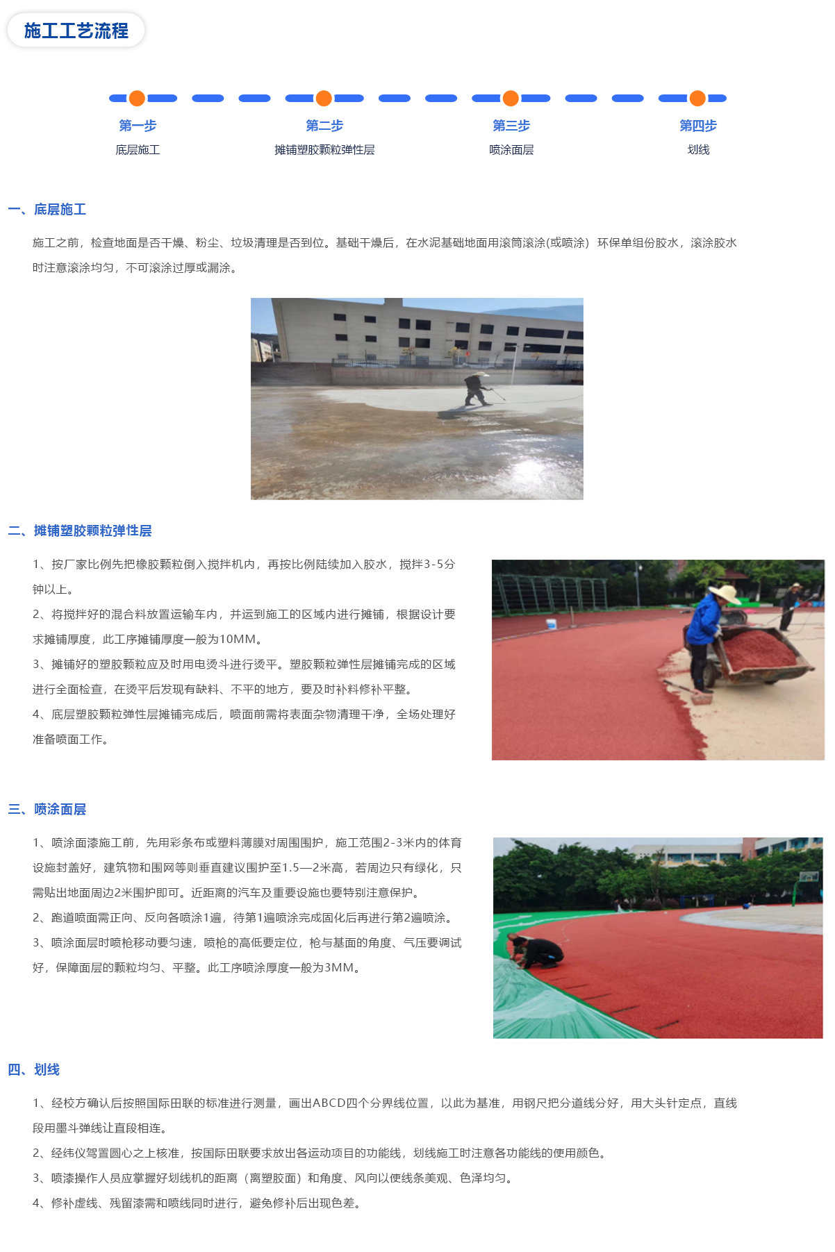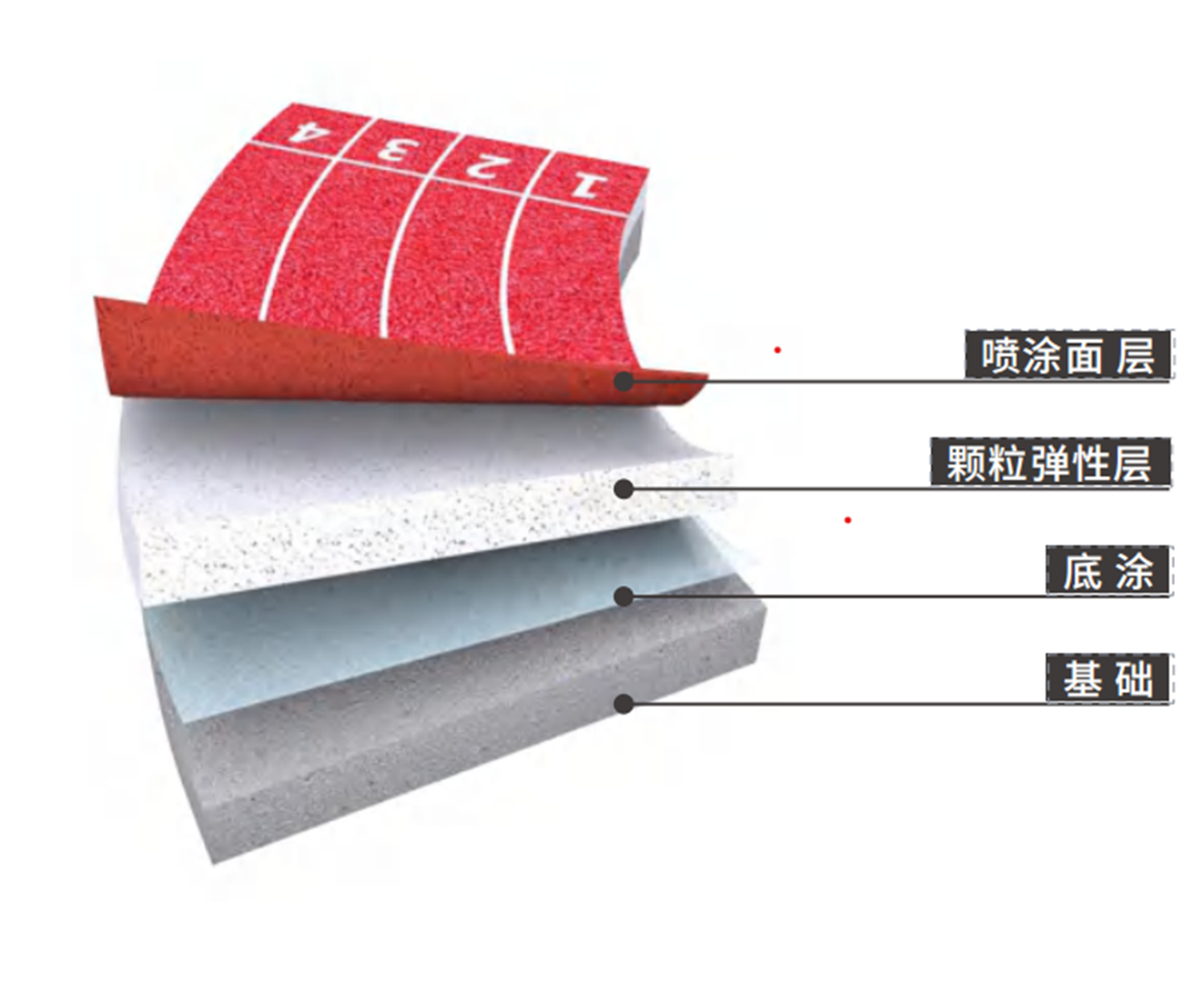 專用高彈性EPDM顆粒噴面,表面顏色柔和,顆粒狀表面,防止刺眼光線的反射,美觀耐用,并可采用多色彩搭配。